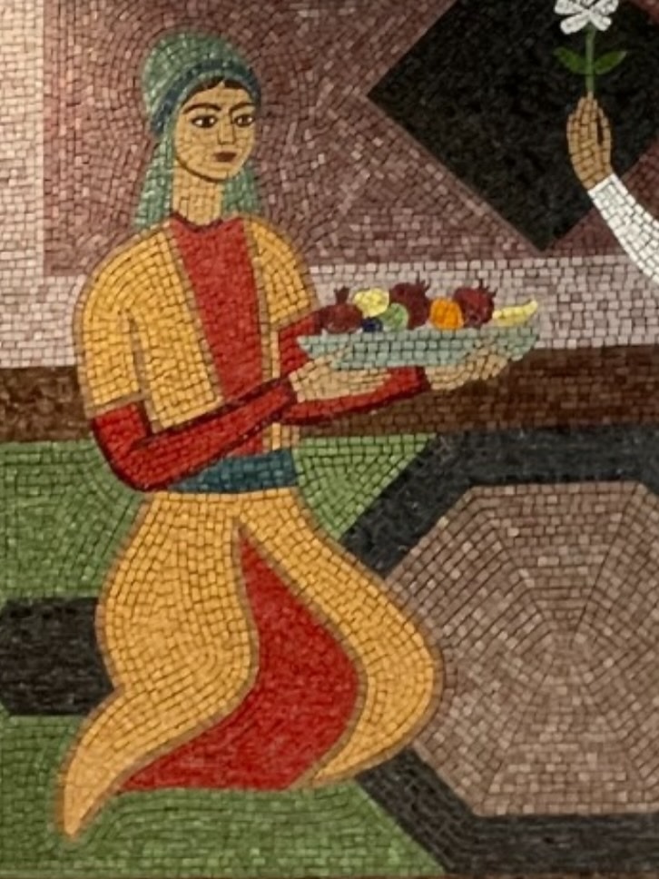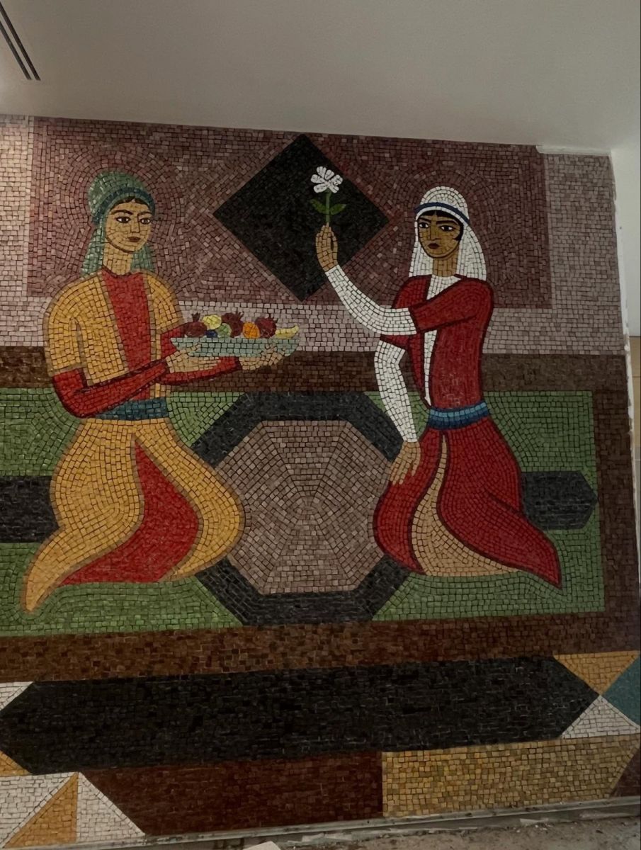 Новое панно отличается насыщенной цветовой палитрой, которая сразу привлекает внимание и придаёт интерьеру особую выразительность. Работа получилась крупной по масштабу и занимает сразу две стены, формируя цельное художественное пространство. Яркие цвета, динамика форм и ритм композиции создают ощущение движения и жизни. В мозаике тонко и выразительно отражены национальные элементы, органично вплетённые в современную интерпретацию. Эти детали не декларируются напрямую, но считываются на уровне образов и ассоциаций, создавая ощущение глубинной связи с культурной традицией и исторической памятью.