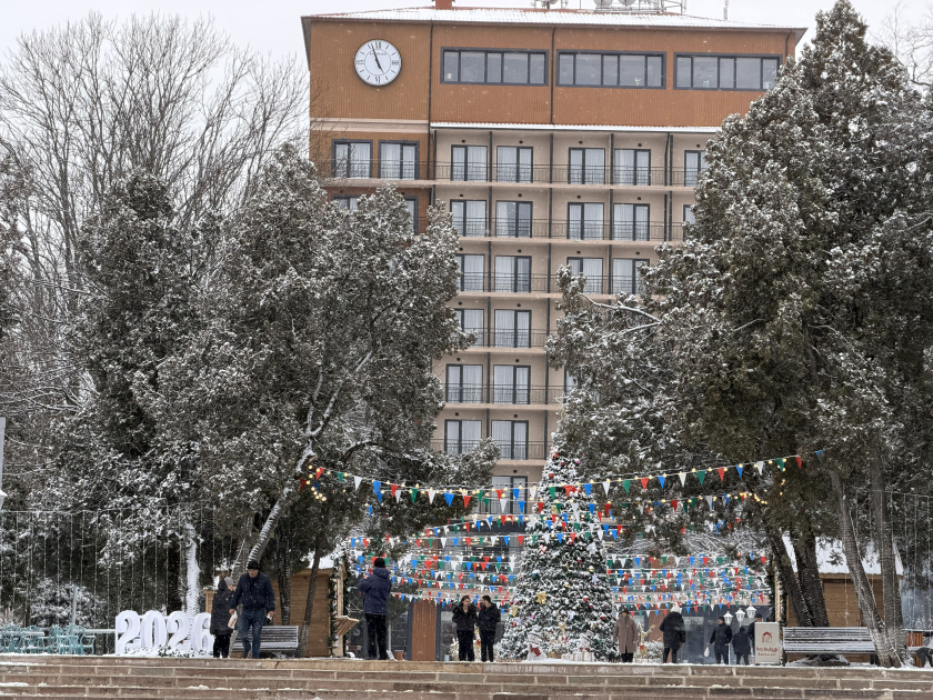 особое очарование. Жители Шуши фотографировались у новогодней ёлки, установленной в парке «Гюллю баг», и радовались первому снегу.
