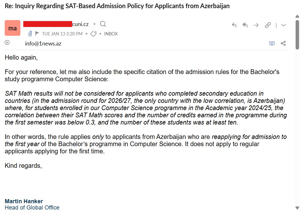 Таким образом, редакция 1news.az сочла необходимым обратиться напрямую в Charles University с целью уточнения причин такого решения и получения официальной позиции со стороны университета. Полученный ответ стал ключевым подтверждением того, что опасения, высказанные ранее, имеют под собой конкретные основания.