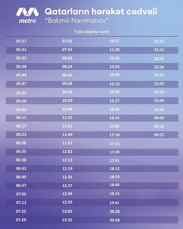«С 4 марта будут внесены изменения в движение поездов до станции «Бакмил» и обратно. В период испытаний пассажирам, следующими по участку «Нариманов – Бакмил», предоставляется обновлённое расписание. Дополнительная информация о ходе испытаний и движении поездов в этом направлении будет доступна широкой публике», — отмечается в сообщении.