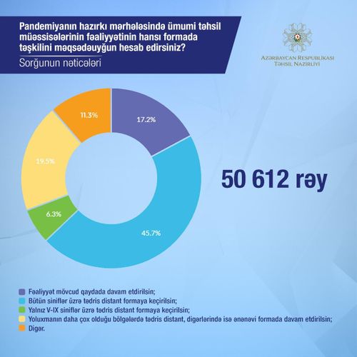 Sorğuda iştirak edənlərin 17.2 faizi fəaliyyətin mövcud qaydada davam etdirilməsini, 45.7 faizi bütün siniflər üzrə tədrisin distant formaya keçirilməsini, 6.3 faizi yalnız 5-9-cu siniflər üzrə tədrisin distant formada olmasını dəstəkləyib.