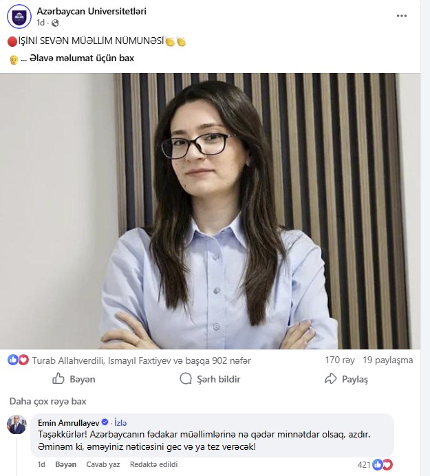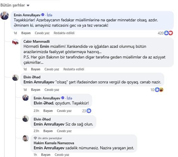 Elm və təhsil naziri Emin Əmrullayevin sosial şəbəkə paylaşımlarına aktiv şəkildə rəy yazması diqqət çəkib.