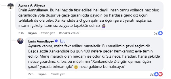 Bir istifadəçi uzun yolun təhlükəli olduğunu bildirib. Nazir isə bunun müəllimin şəxsi seçimi olduğunu, Xankəndidə artıq 400-ə yaxın müəllimin evlə təmin edildiyini qeyd edərək, istifadəçinin necə belə nəticəyə gəldiyini soruşub.