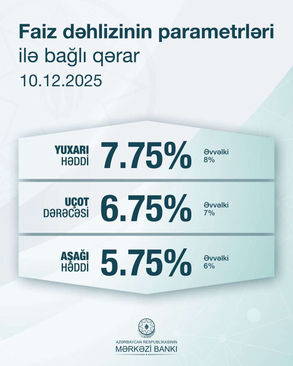 Azərbaycan Respublikası Mərkəzi Bankının İdarə Heyətinin qərarı ilə faiz dəhlizinin bütün parametrləri 0.25 faiz bəndi azaldılıb.