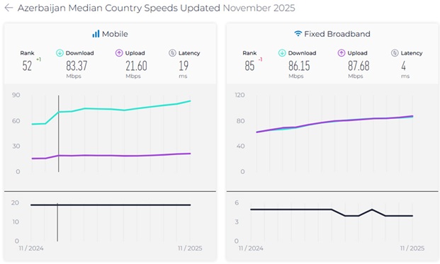 Genişzolaqlı və mobil şəbəkə keyfiyyətinin qiymətləndirilməsi üzrə qlobal şirkət olan “Ookla” noyabr ayı üzrə “Speedtest Global Index” hesabatını təqdim edib.