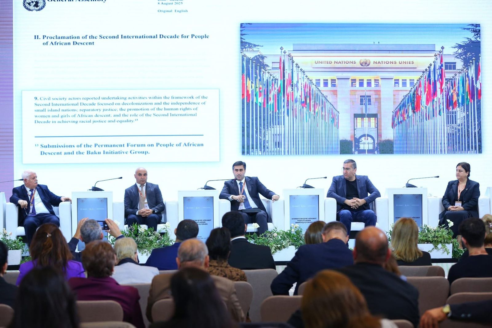 Digər mühüm nailiyyət kimi qeyd etmək olar ki, 2025-ci ilin aprel ayında BMT-nin Nyu-Yorkdakı mənzil-qərargahında Afrika mənşəli xalqların Daimi Forumun sessiyası çərçivəsində beynəlxalq konfrans təşkil edilmişdir. Sözügedən əməkdaşlıq çərçivəsində BMT Baş Assambleyasının iclas zalında rəsmi bəyanatla çıxış edilmiş, eyni zamanda Afrika mənşəli şəxslərə dair 2015–2024-cü illəri əhatə edən Beynəlxalq Onillik kontekstində xüsusi hesabat təqdim olunmuşdur. Təqdim edilən hesabat BMT Baş katibinin “Afrika mənşəli şəxslərin tanınması, onlara ədalətli münasibətin təmin edilməsi və inkişaflarının təşviqi” mövzusunda, Beynəlxalq Onillik çərçivəsində hazırlanmış məruzəsinə daxil edilmişdir. Qeyd edək ki, bu cür hesabatlar Baş katib tərəfindən on ildə bir dəfə hazırlanır və təqdim olunan materialın Baş katib Antonio Quterreşin rəsmi məruzəsində yer alması təşkilatın beynəlxalq platformadakı fəaliyyətinin mühüm əhəmiyyət daşıyan nəticəsi kimi qiymətləndirilə bilər. Bununla yanaşı, təşkilat BMT-nin müxtəlif platformalarında, dənizaşırı ərazilərin müstəqilliyi və dekolonizasiya proseslərinə həsr olunmuş hərəkat həmçinin siyasi partiyaların beynəlxalq konfranslarında mütəmadi çıxışlar edir. Bundan əlavə olaraq, iki il ərzində BMT İnsan Hüquqları Şurasının sessiyalarında ardıcıl şəkildə rəsmi bəyanatlarla iştirakımızı davam etdiririk.