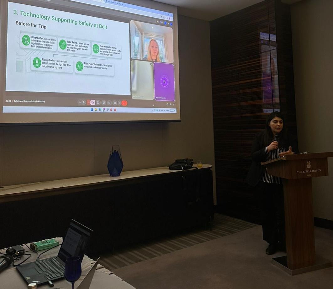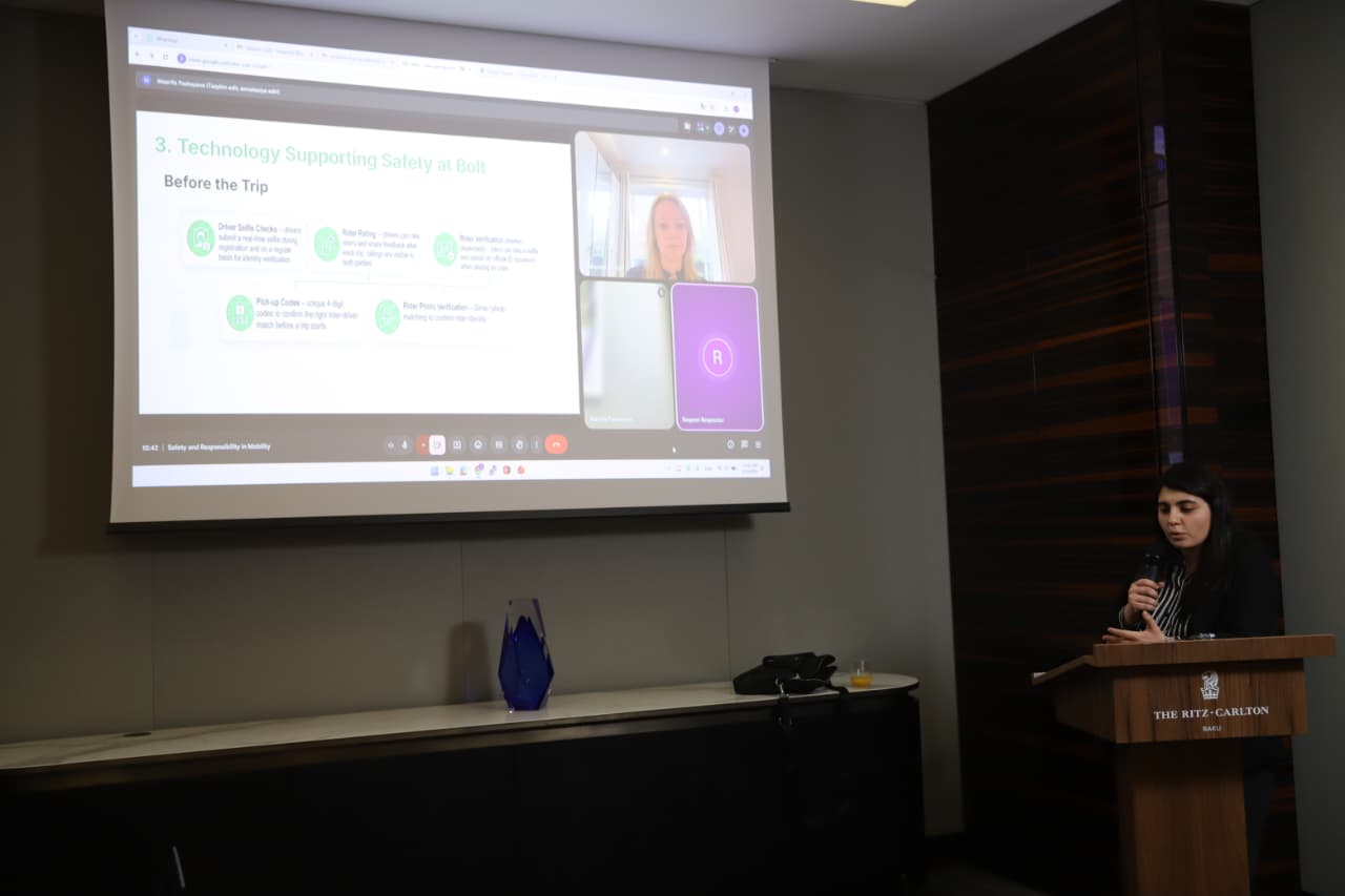 Daha sonra Bolt-un Azərbaycanda Dövlət əlaqələri üzrə rəhbəri Maarifə Paşayeva platformada tətbiq olunan texnoloji təhlükəsizlik həlləri haqqında təqdimatla çıxış edib. O, real vaxt izləmə, məlumatların şəffaflığı, hesabat və şikayət mexanizmləri, eləcə də platforma nəzarət alətləri barədə ətraflı məlumat verib.