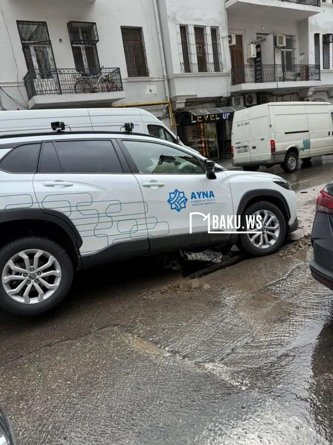 Azadlıq prospektində yolun asfalt qatı çöküb və AYNA-nın maşını həmin çuxura düşüb.