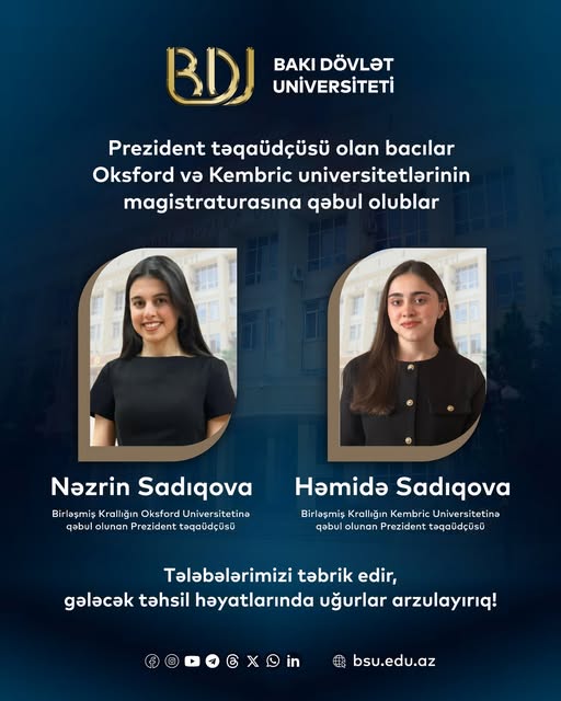 Bakı Dövlət Universitetinin (BDU) Hüquq fakültəsinin IV kurs tələbələri, Prezident təqaüdçüsü olan Həmidə və Nəzrin Sadıqova bacıları “Times Higher Education” (THE) dünya universitetləri reytinqində ilk üçlükdə yer alan Böyük Britaniyanın Oksford və Kembric universitetlərinin magistratura proqramına qəbul alıblar.