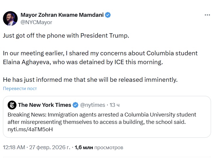 It is noted that on the same day, Elmina Agayeva’s lawyer filed an emergency petition in Manhattan federal court requesting her release from custody, and the case quickly escalated to the highest political level. New York Mayor Zohran Mamdani stated that he raised the issue of the student’s detention during a meeting with US President Donald Trump in Washington on Thursday. Shortly after, Mamdani announced on social media that President Donald Trump informed him that the student would be released soon.