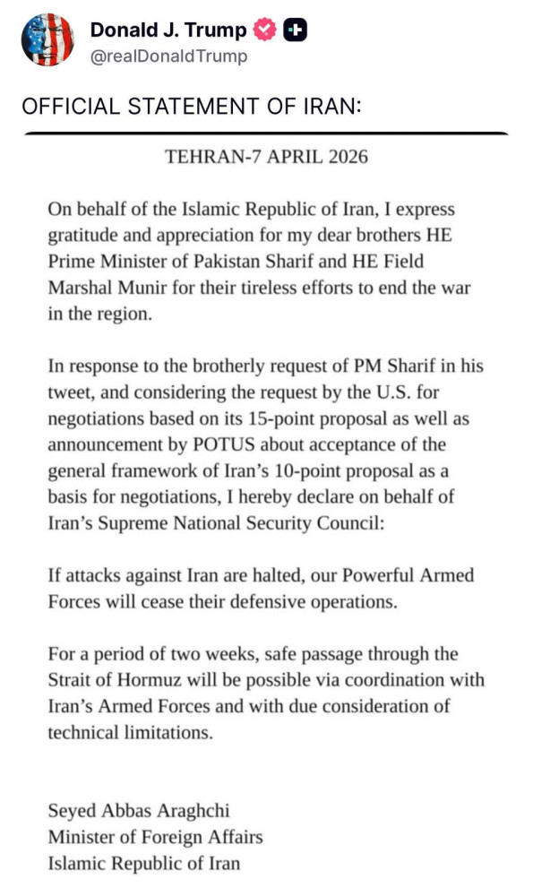 For his part, Iranian Foreign Minister Seyed Abbas Araghchi issued an official statement on behalf of the country's Supreme National Security Council. It states that if attacks against Iran are halted, Iranian armed forces will cease defensive operations. Additionally, over the next two weeks, safe passage for ships through the Strait of Hormuz will be ensured in coordination with Iranian military forces.