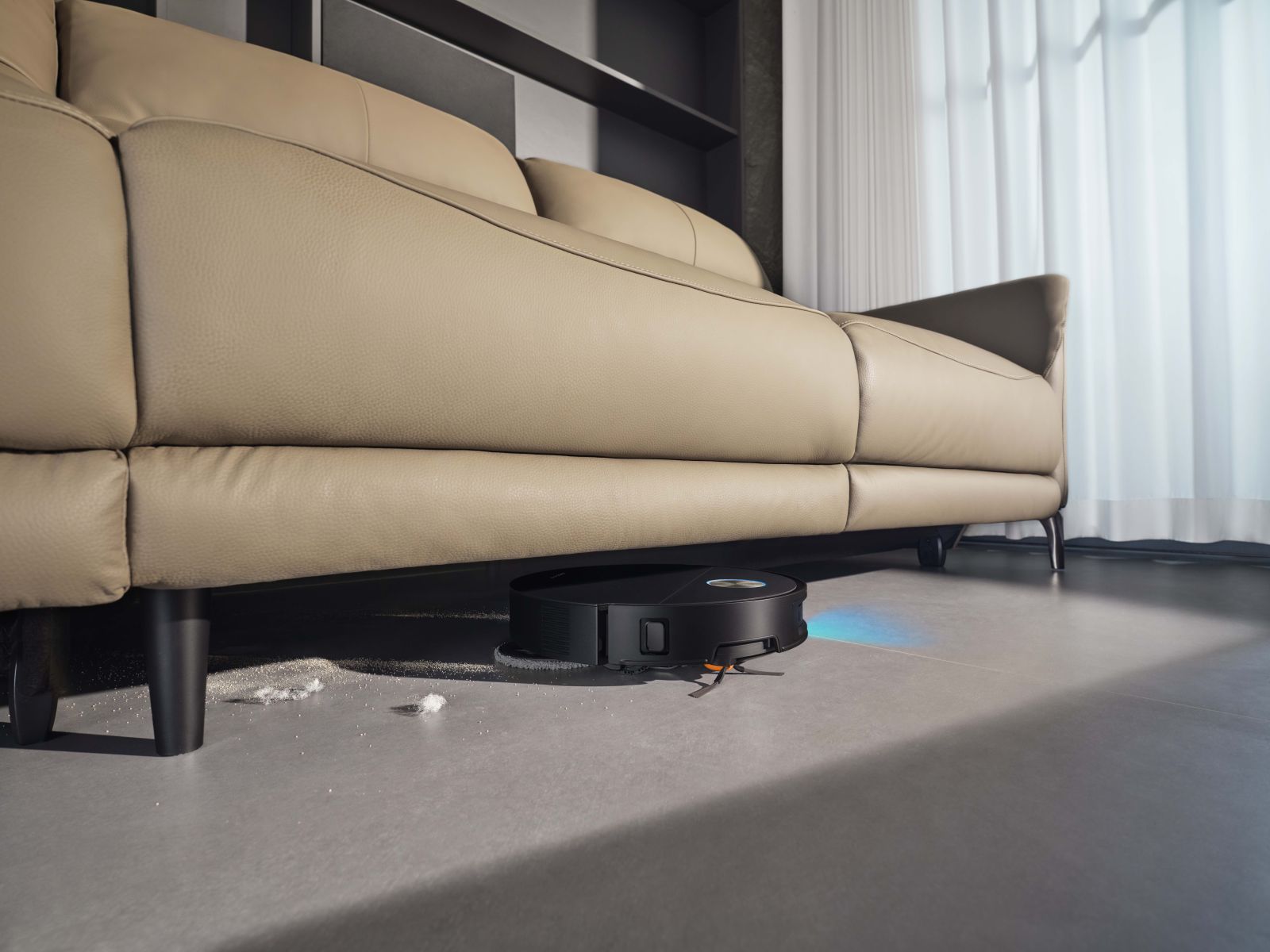 The X60 Ultra Complete was developed to clean areas with complex layouts, low furniture, and thresholds between rooms. The robot's ultra-slim 7.95 cm body, along with a retractable lidar, enables it to clean under sofas, mattresses, and other low-profile furniture.
