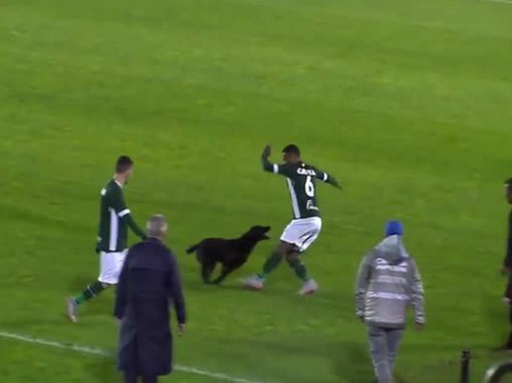 Выбежавший на поле во время матча пес загонял футболиста - ВИДЕО