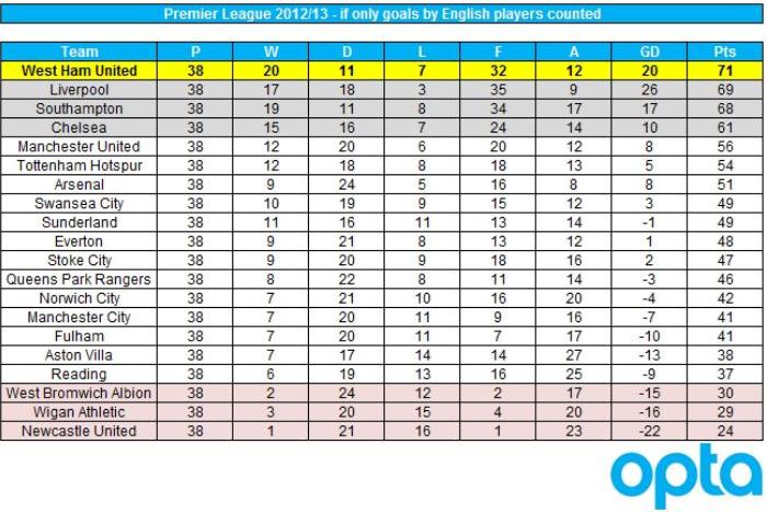 А вы знаете, как бы выглядела таблица Премьер-лиги 2012/13, если бы учитывались голы исключительно англичан?