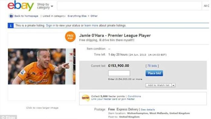 Болельщик "Вулверхэмптона" решил помочь клубу избавиться от полузащитника Джейми О’Хары выставив его в качестве лота на аукционе E-bay.