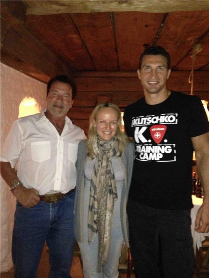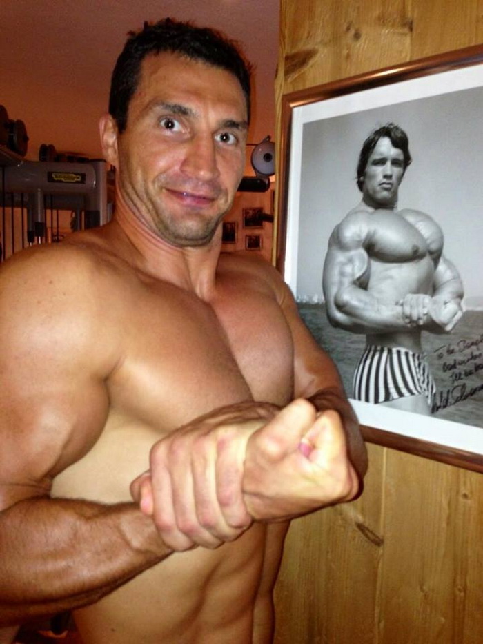 Чемпион мира сфотографировался на фоне плаката, на котором изображен молодой Арнольд Шварценеггер в своей коронной позе культуриста. Кличко-младший скопировал Арни и подписал: