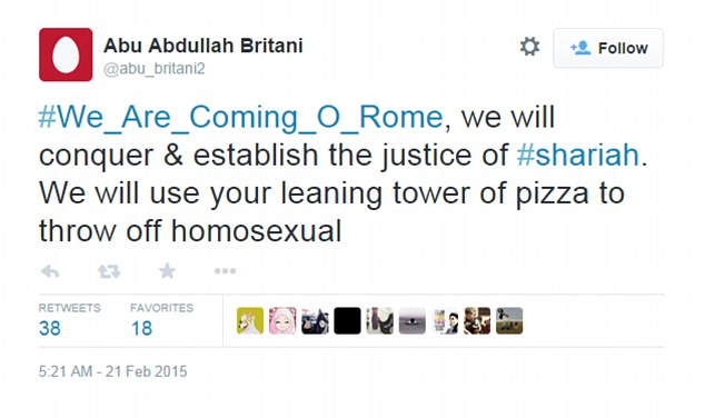 «Мы идем на Рим, мы завоюем его и установим там нормы шариата, а с вашей Пизанской башни мы будем скидывать гомосексуалистов», - написал некий Абу Абдулла аль-Британи.