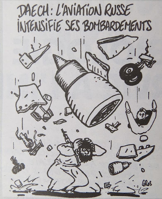 На первой карикатуре изображен схватившийся за голову боевик террористической группировки ИГИЛ, на которого летят обломки самолета. Подпись к карикатуре: «ИГИЛ: Российская авиация усиливает бомбардировки».