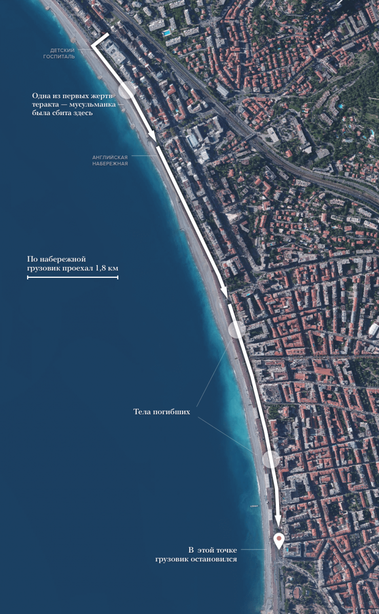 Также «Медуза» со ссылкой на данные The New York Times показывает, как двигался грузовик по набережной.