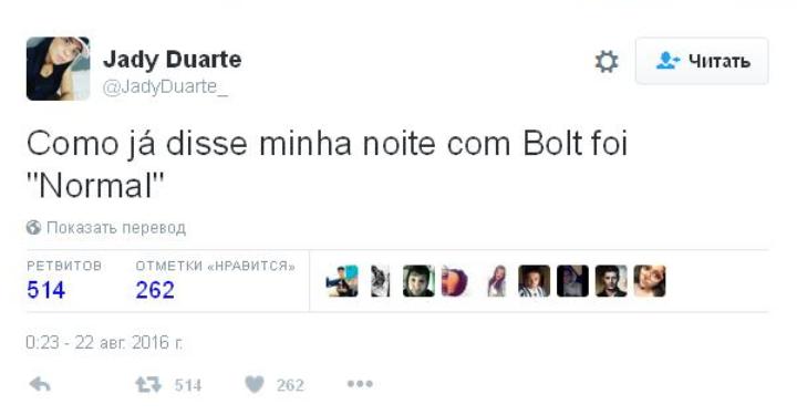 «Я была на вечеринке в Барре, в западной зоне Рио, с друзьями. Тут ко мне подошёл охранник, чтобы договориться о дальнейшем времяпрепровождении. У меня не было ни малейшей идеи, что это - олимпийский чемпион. Там была куча ямайцев, и все они, в принципе, выглядели одинаково». Но потом, видимо, её просветили, и она не постеснялась поделиться в Сети сообщением о том, что в её объятия попал олимпийский чемпион. И, судя по всему, именно она «слила» в Сеть интимные фотографии с атлетом.