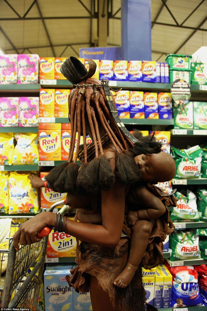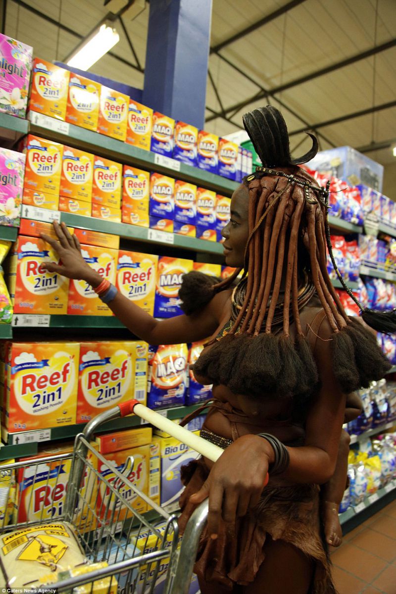 Молодая женщина из африканского племени химба в Намибии в своем традиционном наряде была замечена шведским фотографом в супермаркете, когда покупала для дома предметы первой необходимости.