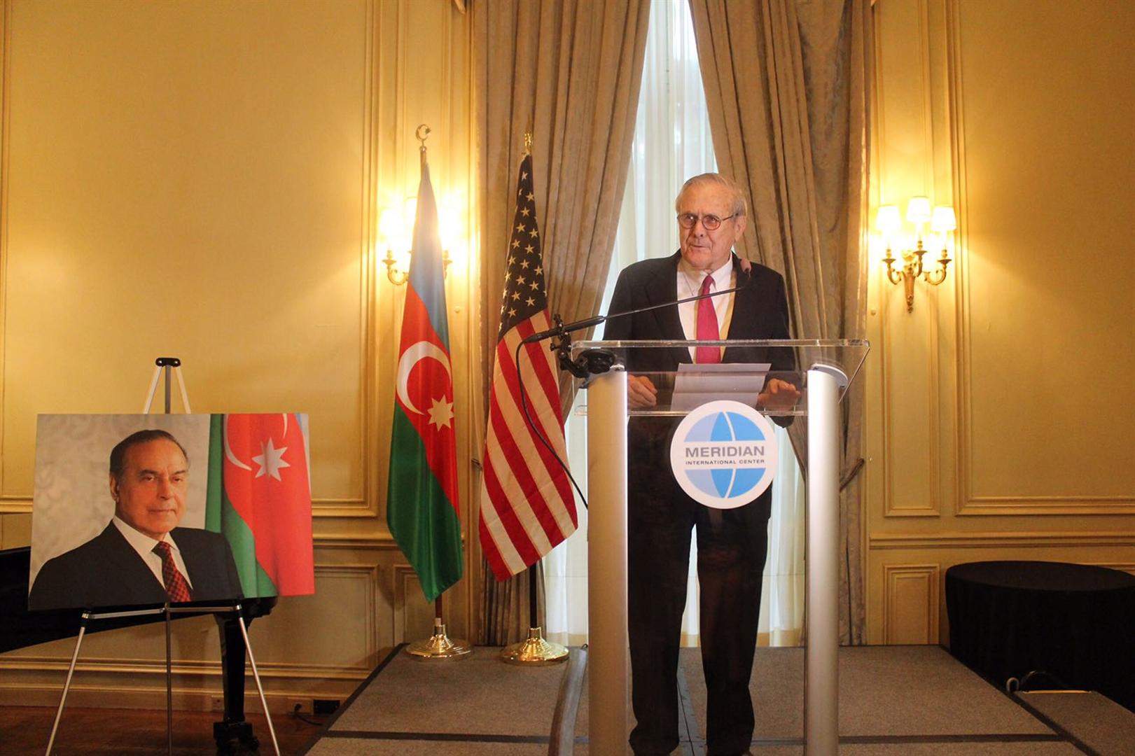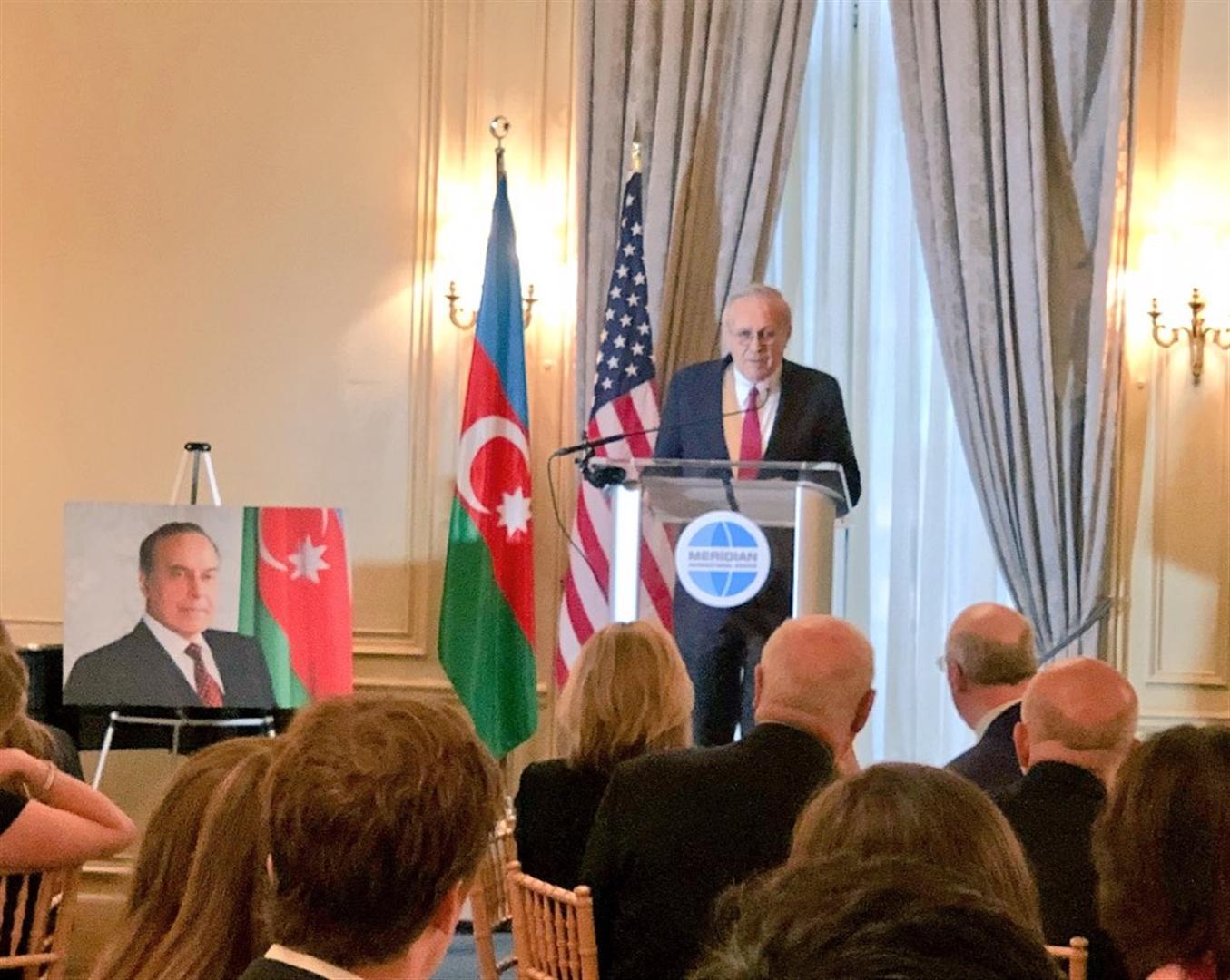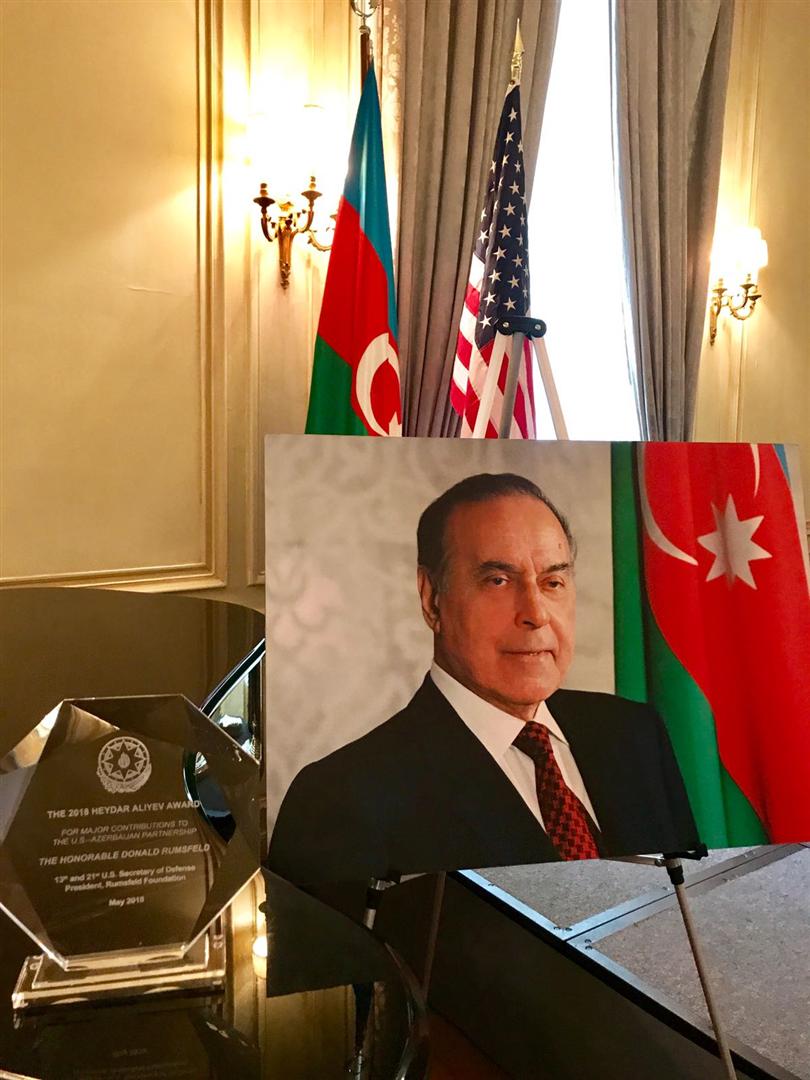 По сообщению посольства Азербайджана, на мероприятии видному государственному деятелю США Дональду Рамсфелду, дважды занимавшему пост министра обороны и другие высокие должности, была вручена почетная награда имени Гейдара Алиева 2018 года за исключительный вклад в азербайджано-американское стратегическое партнерство.