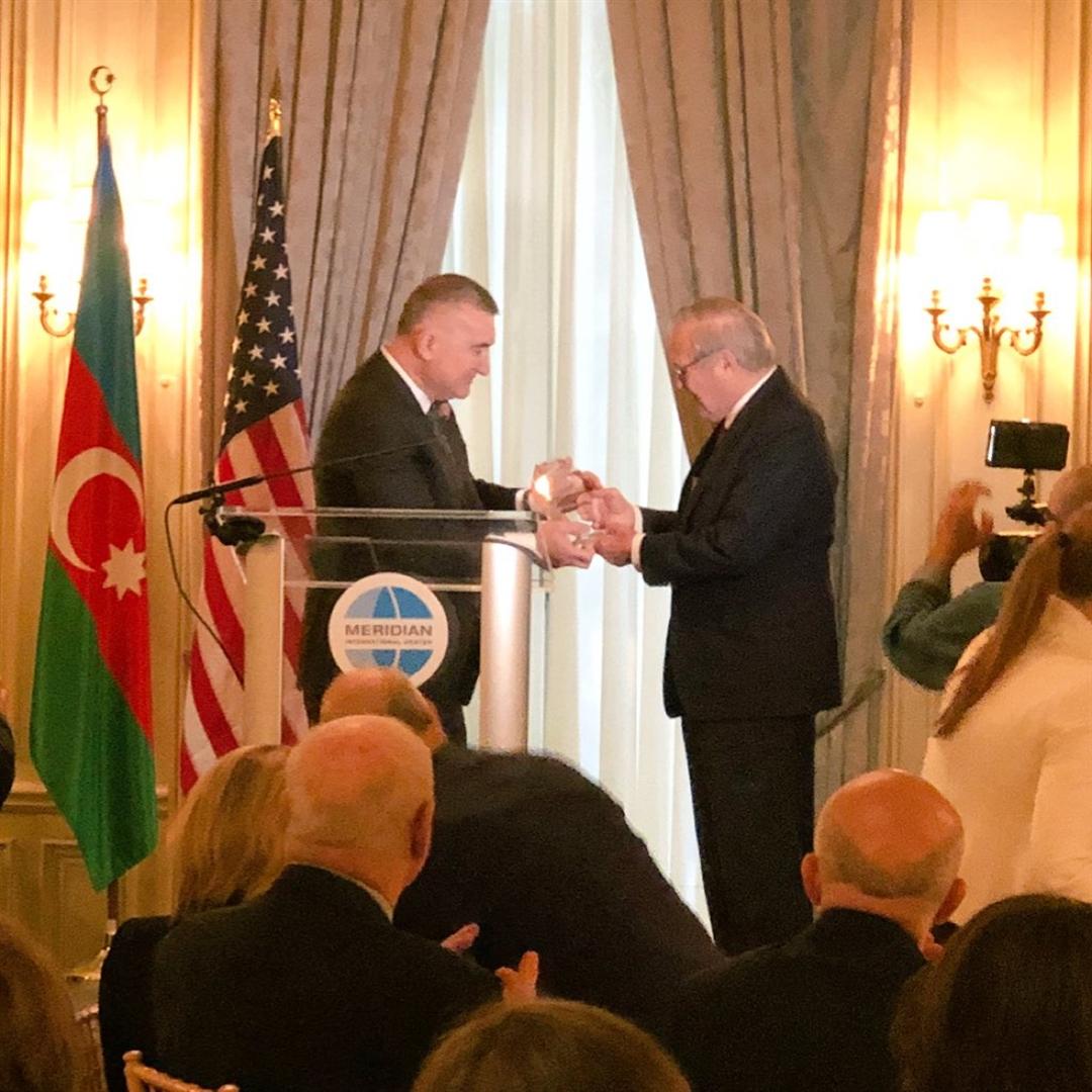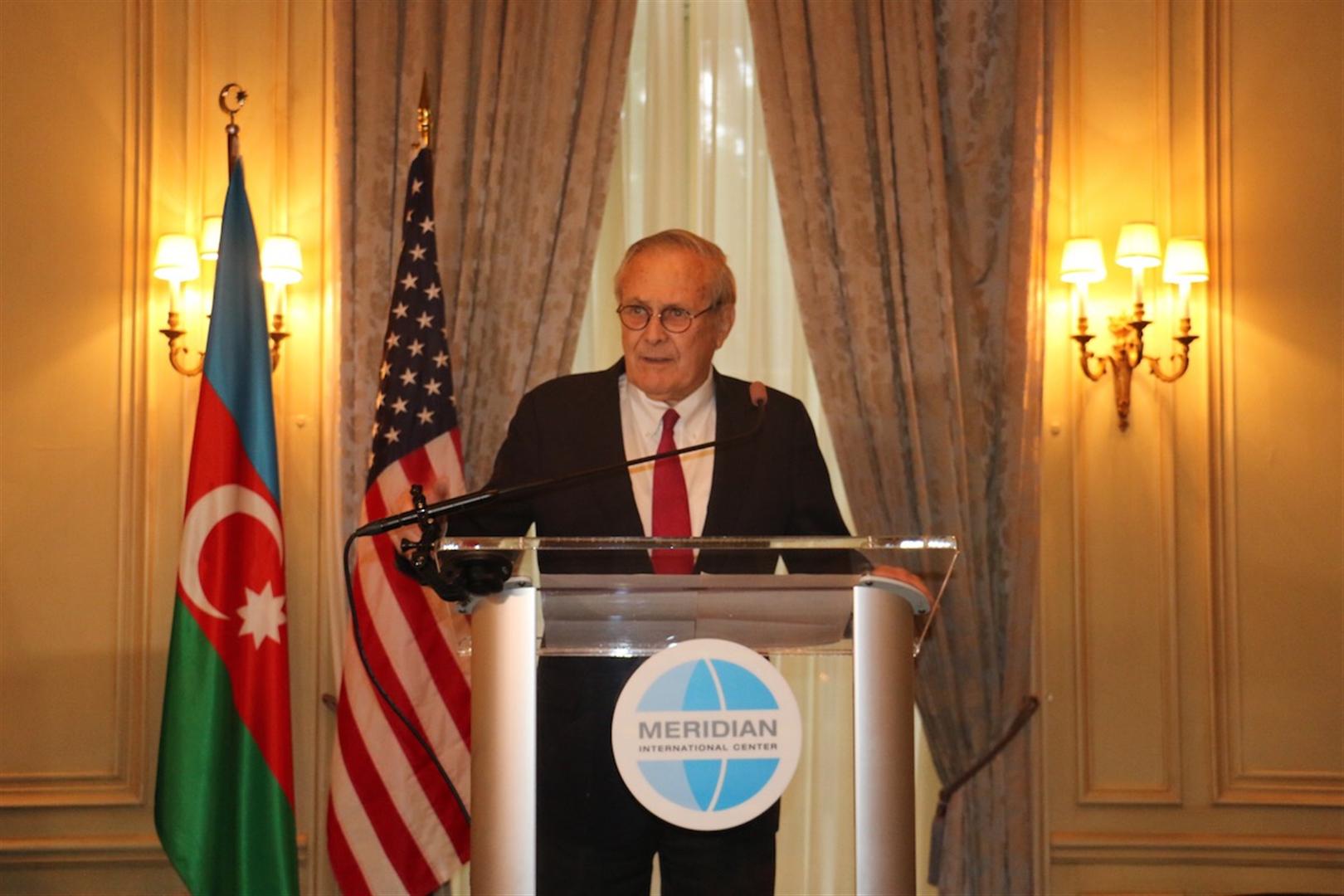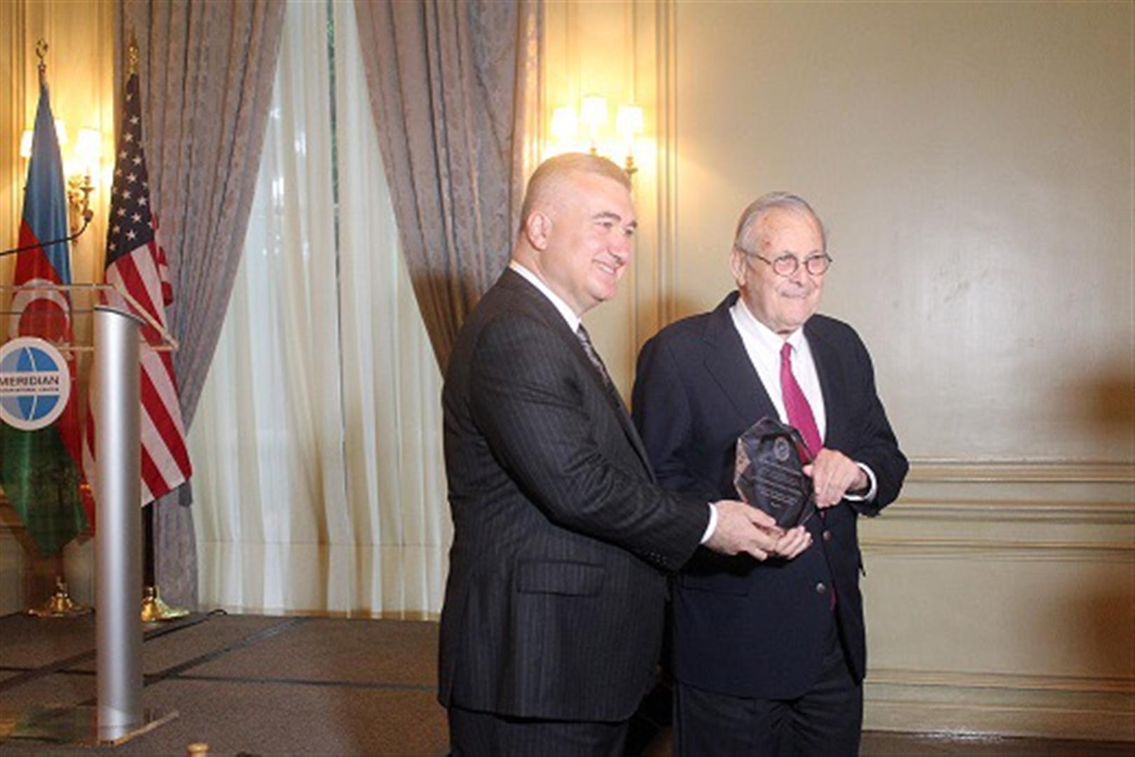 По сообщению посольства Азербайджана, на мероприятии видному государственному деятелю США Дональду Рамсфелду, дважды занимавшему пост министра обороны и другие высокие должности, была вручена почетная награда имени Гейдара Алиева 2018 года за исключительный вклад в азербайджано-американское стратегическое партнерство.