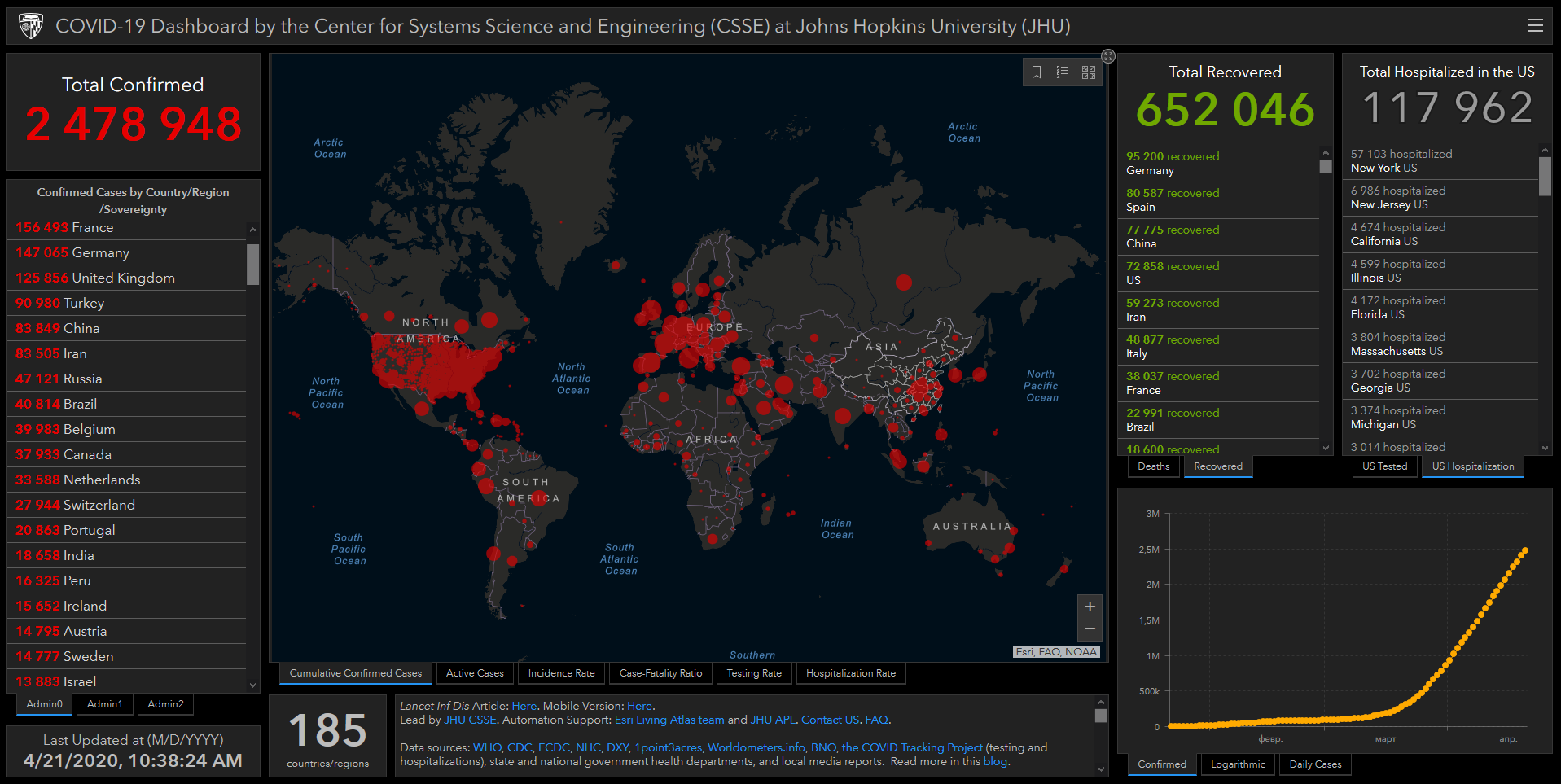 По данным на первую половину вторника, 21 апреля, Covid-19 в мире заражены 2 478 948 человек в 185 странах и регионах мира, из них более 170 тысяч человек скончались, однако уже более 650 тысяч человек выздоровели.