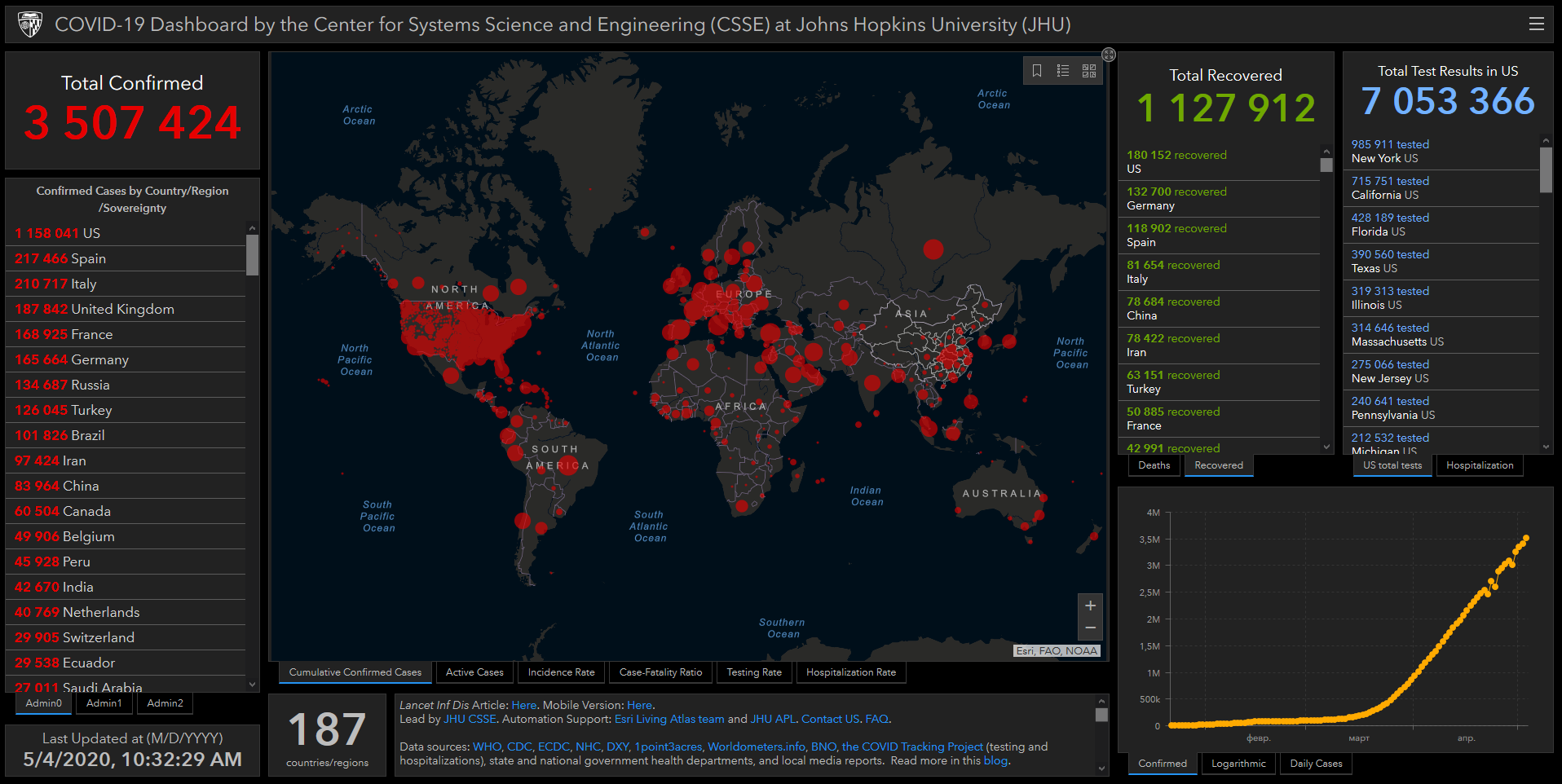 По данным на первую половину понедельника, 4 мая, COVID-19 в мире заражены 3 507 424 человека в 187 странах и регионах, из них более 247 тысяч человек скончались, однако уже около трети заболевших (1,13 млн человек) выздоровели.