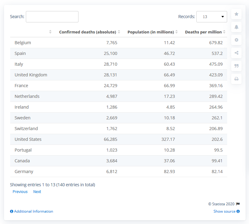 Данные о смертности в расчете на численность населения стран мира приводятся в ежедневно обновляемой таблице на веб-сайте Statista.