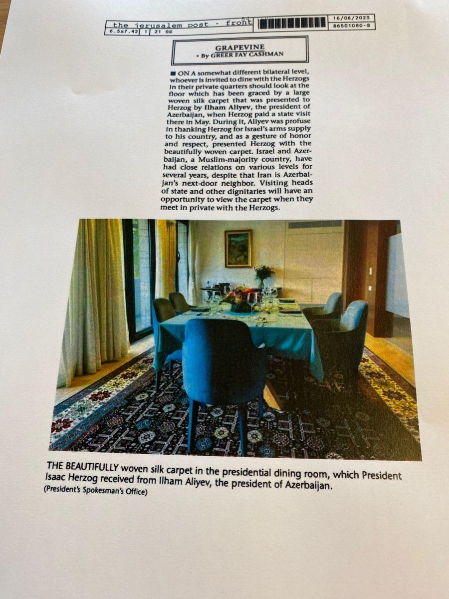 Англоязычная израильская газета The Jerusalem Post, имеющая широкую читательскую аудиторию во всем мире, уделила особое место ковру, подаренному Ильхамом Алиевым президенту Израиля Ицхаку Герцогу.