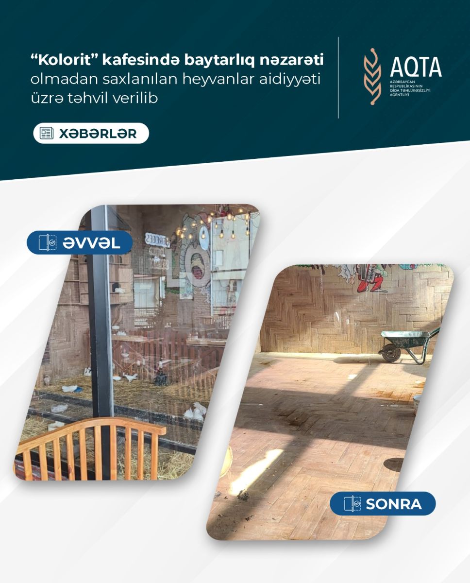 В ходе мониторинга в кафе «Kolorit», принадлежащем частному лицу Фариду Алекберзаде, расположенном в Баку на ул. М. Хади, дом 2094, были выявлены животные и птицы, содержащиеся без ветеринарного контроля (5 голубей, 15 кроликов, 2 петуха, 4 черепахи) - они были переданы соответствующим инстанциям, а также проведены другие необходимые мероприятия.