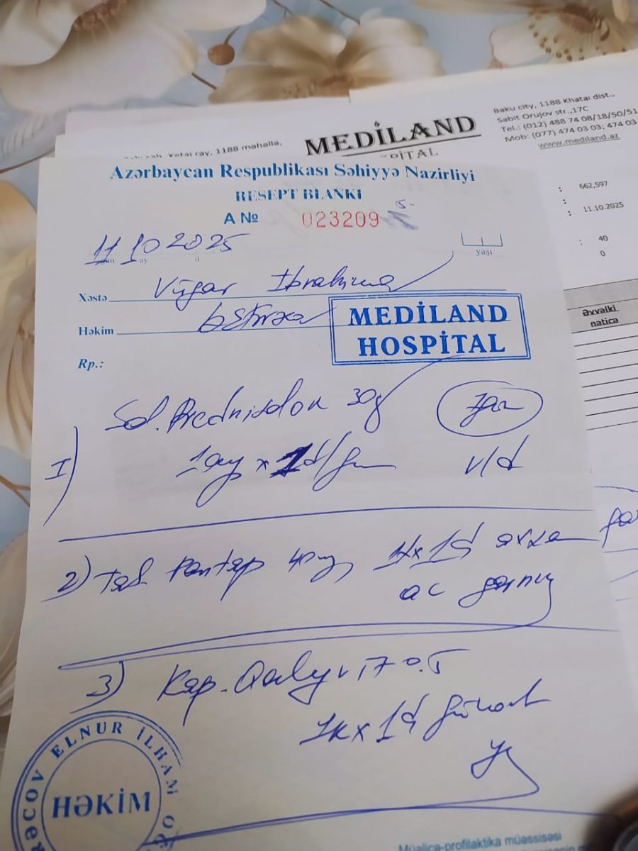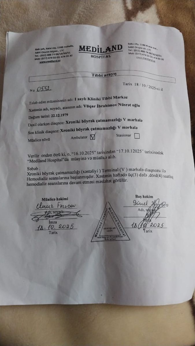 По словам супруги Вюгара Ибрагимова, врачи сообщили, что для необходимого лечения требуется 45 тысяч манатов. Операцию готовы провести по страховке, однако собрать средства на подготовку и лечение семье сейчас не под силу.