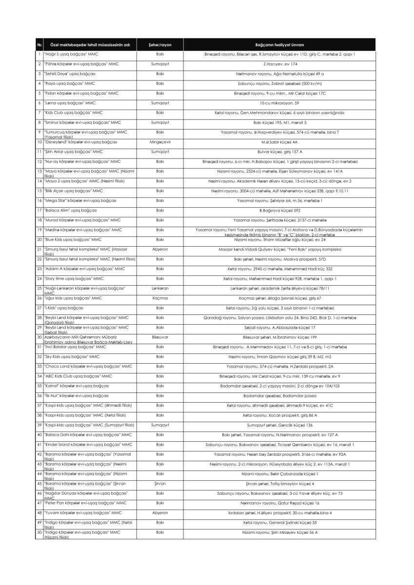 Регистрация детей в частные детские сады, выигравшие грант в азербайджанском секторе, будет осуществляться в ближайшие дни через портал www.bq.edu.az, о чём общественность будет проинформирована заранее. Родителям рекомендуется следить за обновлениями на портале и регистрировать своих детей.