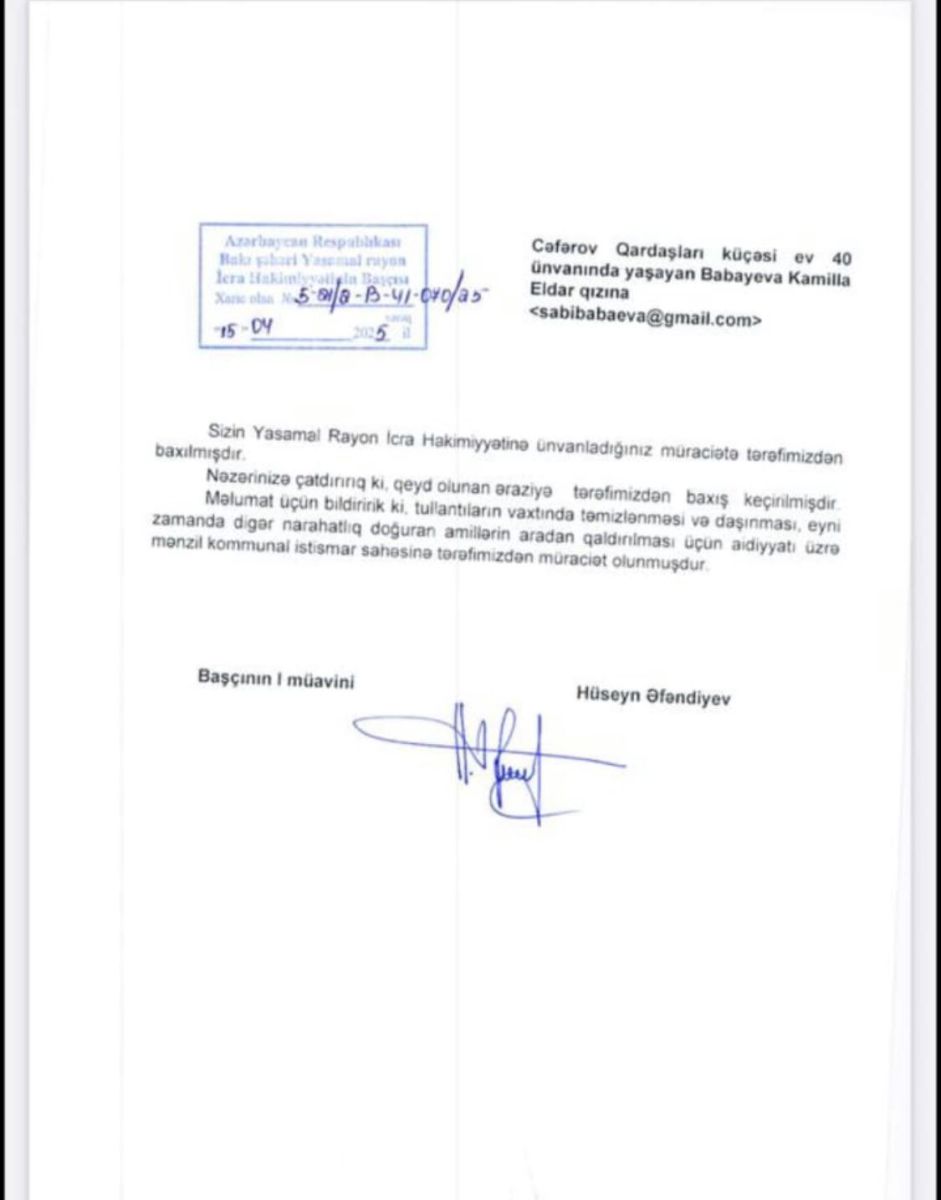 Учитывая призыв жителей к соответствующим органам власти вмешаться и оперативно решить проблему уборки строительных отходов и ликвидации очага антисанитарии, мы обратились в Исполнительную власть Ясамальского района, чтобы прояснить ситуацию.