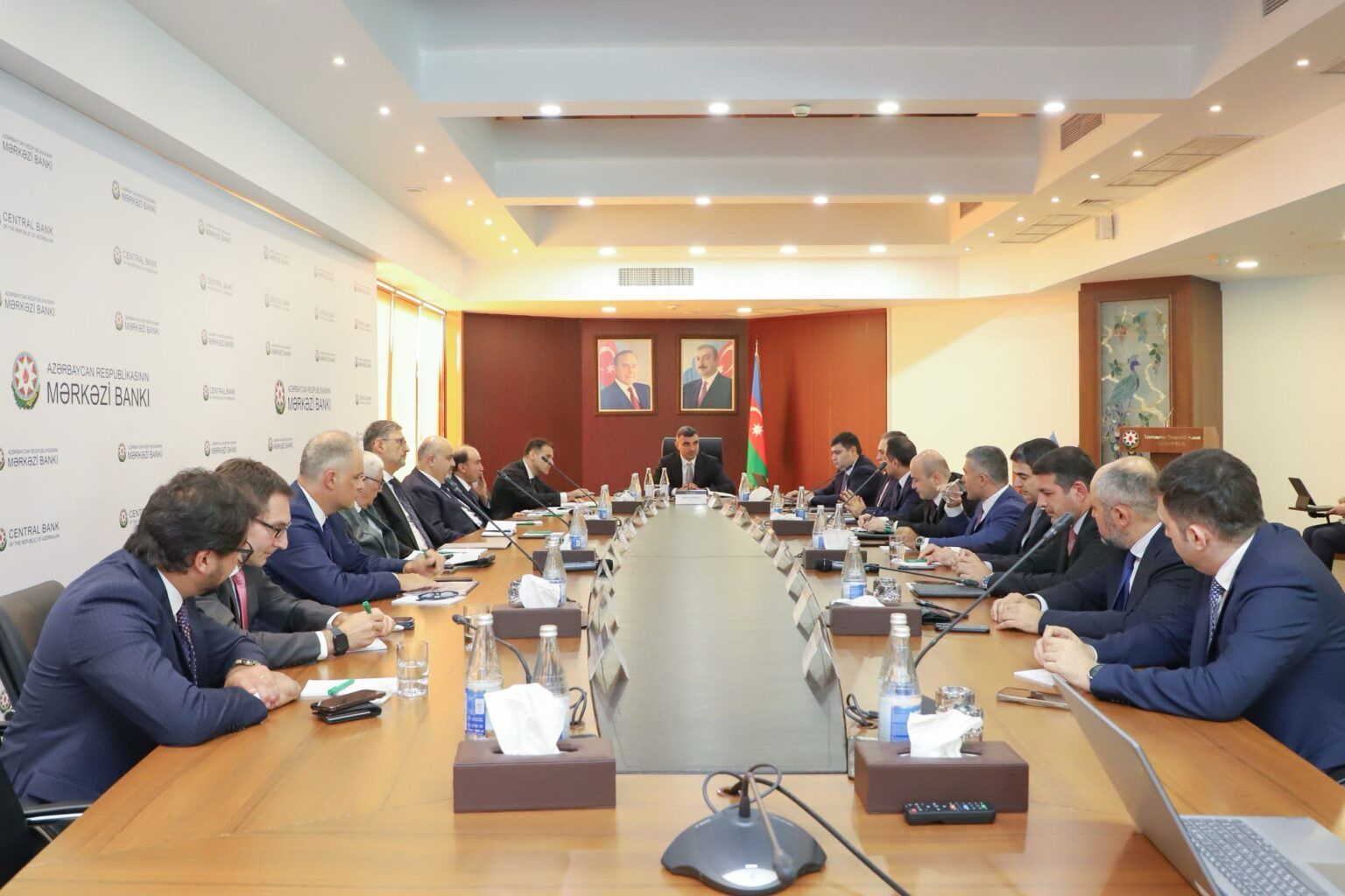 На фото: Председатель Центрального банка Азербайджанской Республики Талех Казымов проводит встречу с членами Президиума Ассоциации банков Азербайджана.