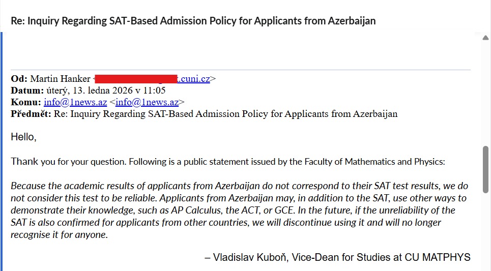 Таким образом, редакция 1news.az сочла необходимым обратиться напрямую в Charles University с целью уточнения причин такого решения и получения официальной позиции со стороны университета. Полученный ответ стал ключевым подтверждением того, что опасения, высказанные ранее, имеют под собой конкретные основания.