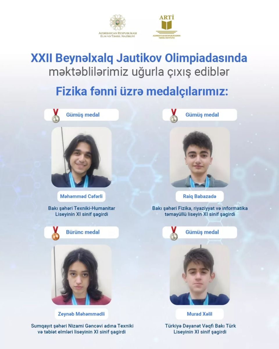Как передает 1news.az, по физике серебряные медали были вручены ученику XI класса Технико-гуманитарного лицея города Баку Мухаммеду Джафарли, ученику XI класса лицея с уклоном физики, математики и информатики города Баку Раигу Бабазаде и ученику XI класса Бакинского турецкого лицея Фонда «Даянат» Мураду Халилу, а бронзовая медаль — ученице XI класса Лицея технических и природных наук имени Низами Гянджави города Сумгайыт Зейнаб Маммедли.