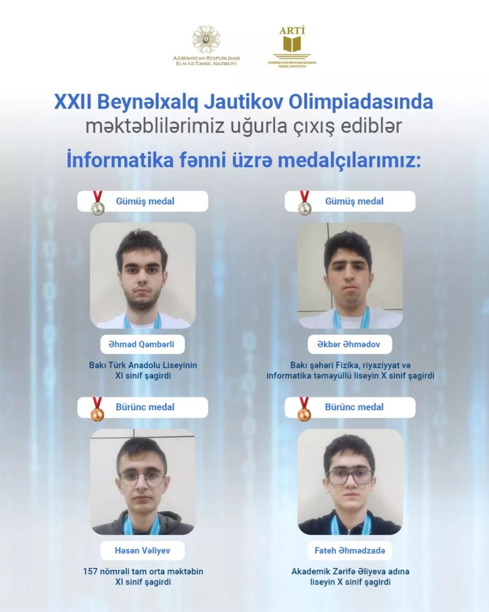 По информатике серебряных медалей были удостоены ученик XI класса Бакинского турецкого анатолийского лицея Ахмед Гамбарли и ученик X класса лицея с уклоном физики, математики и информатики города Баку Акпер Ахмедов, а бронзовых медалей - ученик XI класса полной средней школы №157 Гасан Велиев и ученик X класса лицея имени академика Зарифы Алиевой Фатех Ахмедзаде.