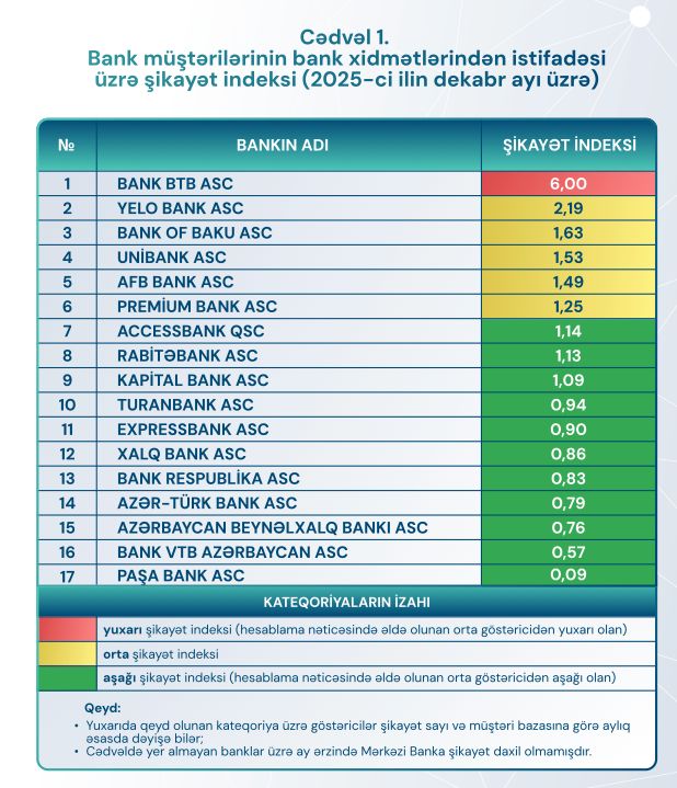 Если финансовая отчётность описывает внутреннее состояние банка, то индекс жалоб клиентов, публикуемый Центральным банком Азербайджана, даёт внешний взгляд. Индекс измеряет жалобы, поступившие регулятору, относительно доли каждого банка в активных клиентах.