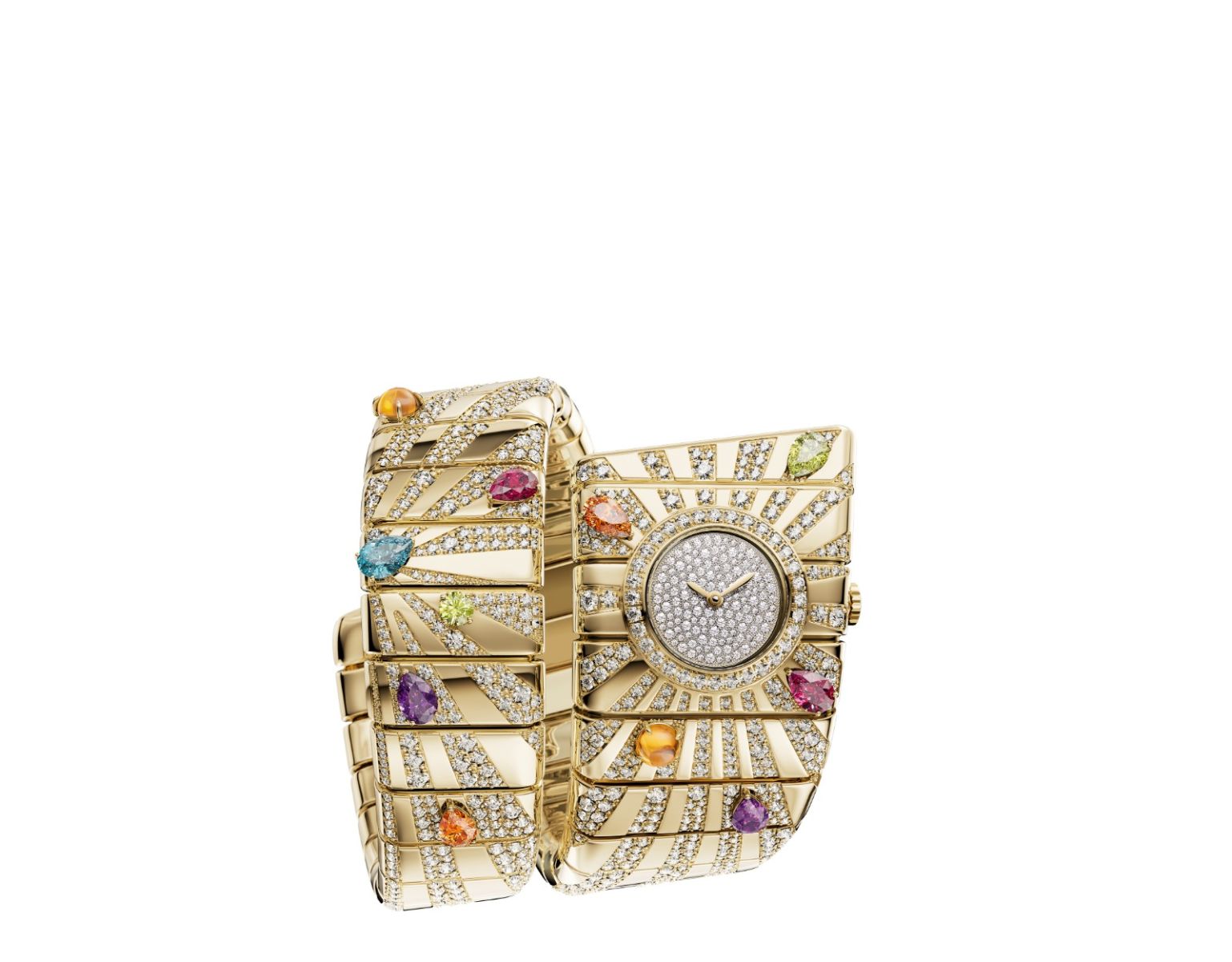 Сияние в его самой ослепительной форме: бриллианты оттеняет щедрое обрамление цветных камней, — Tubogas Manchette возвращается к архивной модели 1974 года. Часы воспроизводят смелую геометрию оригинала, сочетая квадратный циферблат с широким браслетом Tubogas в один ряд. Золото наполняется радостью жизни - красочным пламенем из цитринов, рубеллитов, перидотов, аметистов, топазов и спессартинов. Почти 12 карат бриллиантов мерцают вдоль витков браслета, создавая ослепительный фон для яркой палитры драгоценных камней.