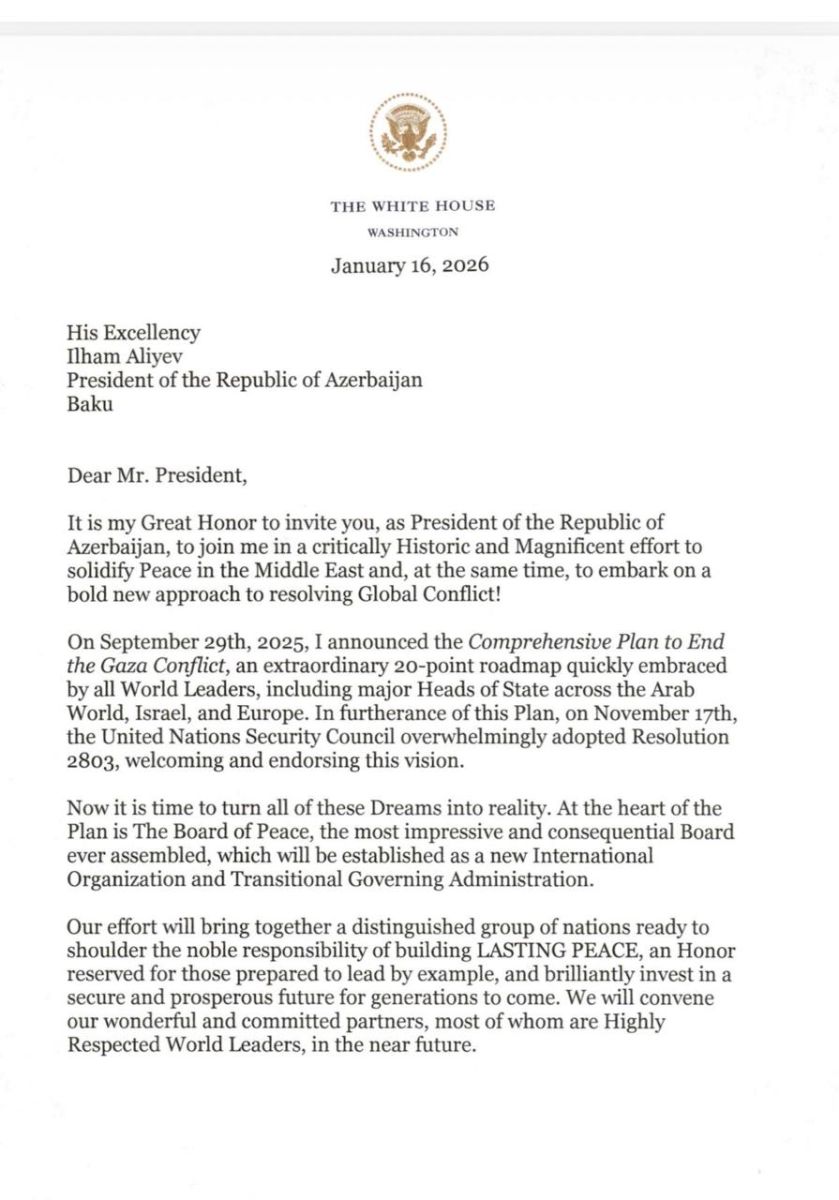 Президент Соединённых Штатов Америки Дональд Трамп направил письмо Президенту Азербайджанской Республики Ильхаму Алиеву.