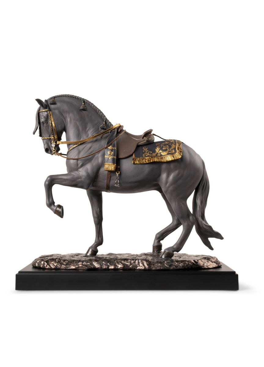 Кульминацией серии становится Spanish Pure Breed (Black) — изделие из коллекции High Porcelain, выпущенное лимитированным тиражом в 500 экземпляров. Скульптура вдохновлена лошадьми Королевской андалузской школы верховой езды и выполнена из черного матового фарфора с использованием золотого люстра, металлических элементов и деталей из натуральной кожи. Это изделие воплощает церемониальную красоту, дисциплину и мощь испанской чистокровной породы, демонстрируя высочайший уровень технического и художественного мастерства Lladró.