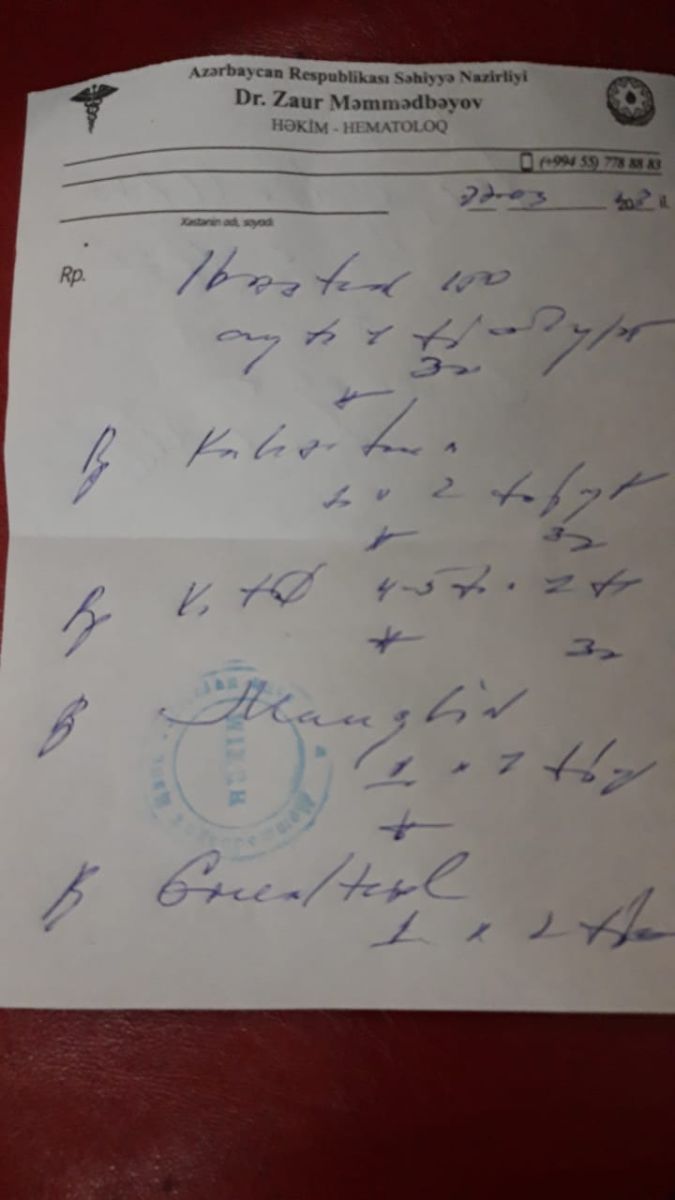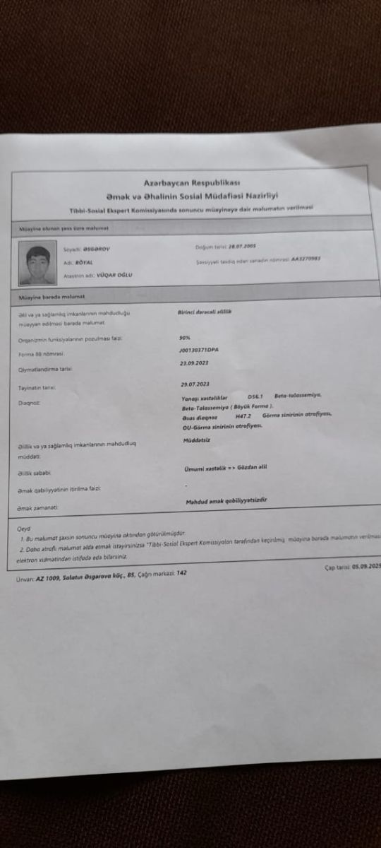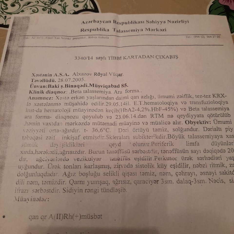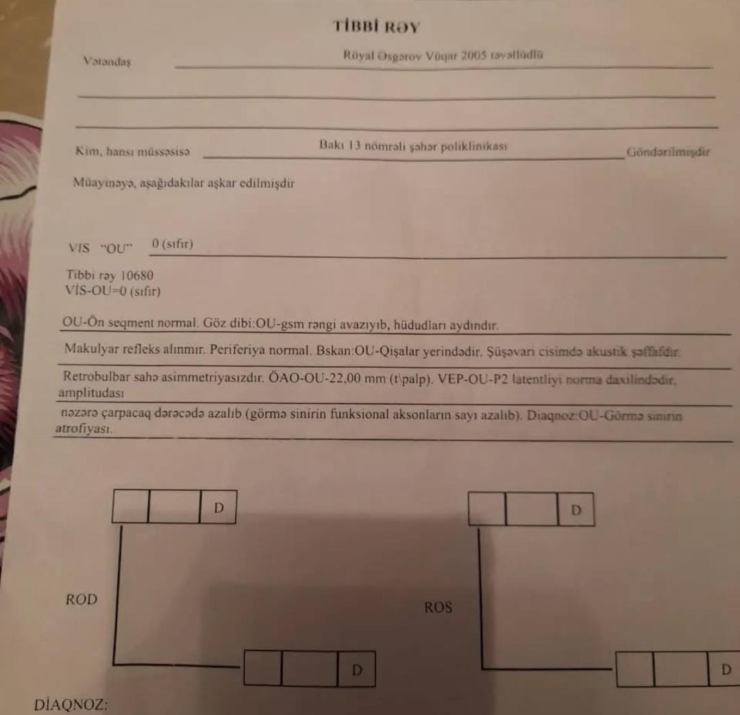 По словам матери, на лечение Рояла требуется 700 манатов. У юноши зафиксирован повышенный уровень железа в крови и сердце, терапия приостановлена из-за нехватки средств, а зрение утрачено окончательно.