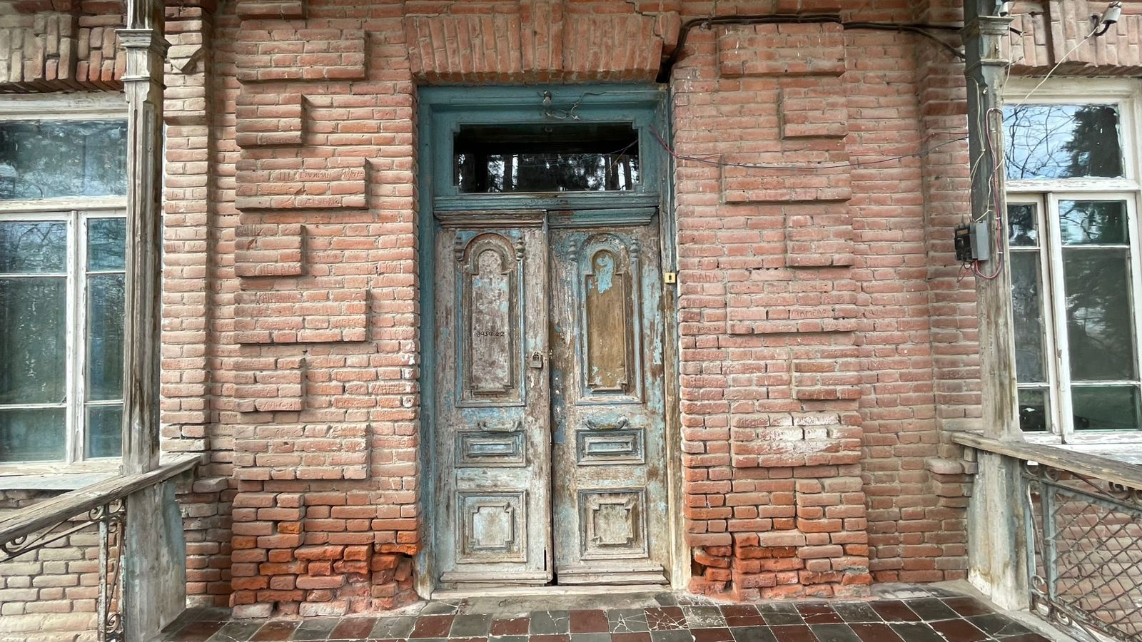 Главный вход подчеркнут деревянной верандой на опорах с балконом второго этажа, выполненной в традициях местного деревянного зодчества. Лёгкость деревянных конструкций вступает в выразительный диалог с тяжеловесностью кирпичного объёма. Балкон служил как функциональным, так и композиционным элементом, формируя вертикальный акцент фасада. Особое впечатление производит резная деревянная дверь, подчёркивающая представительный характер дома.