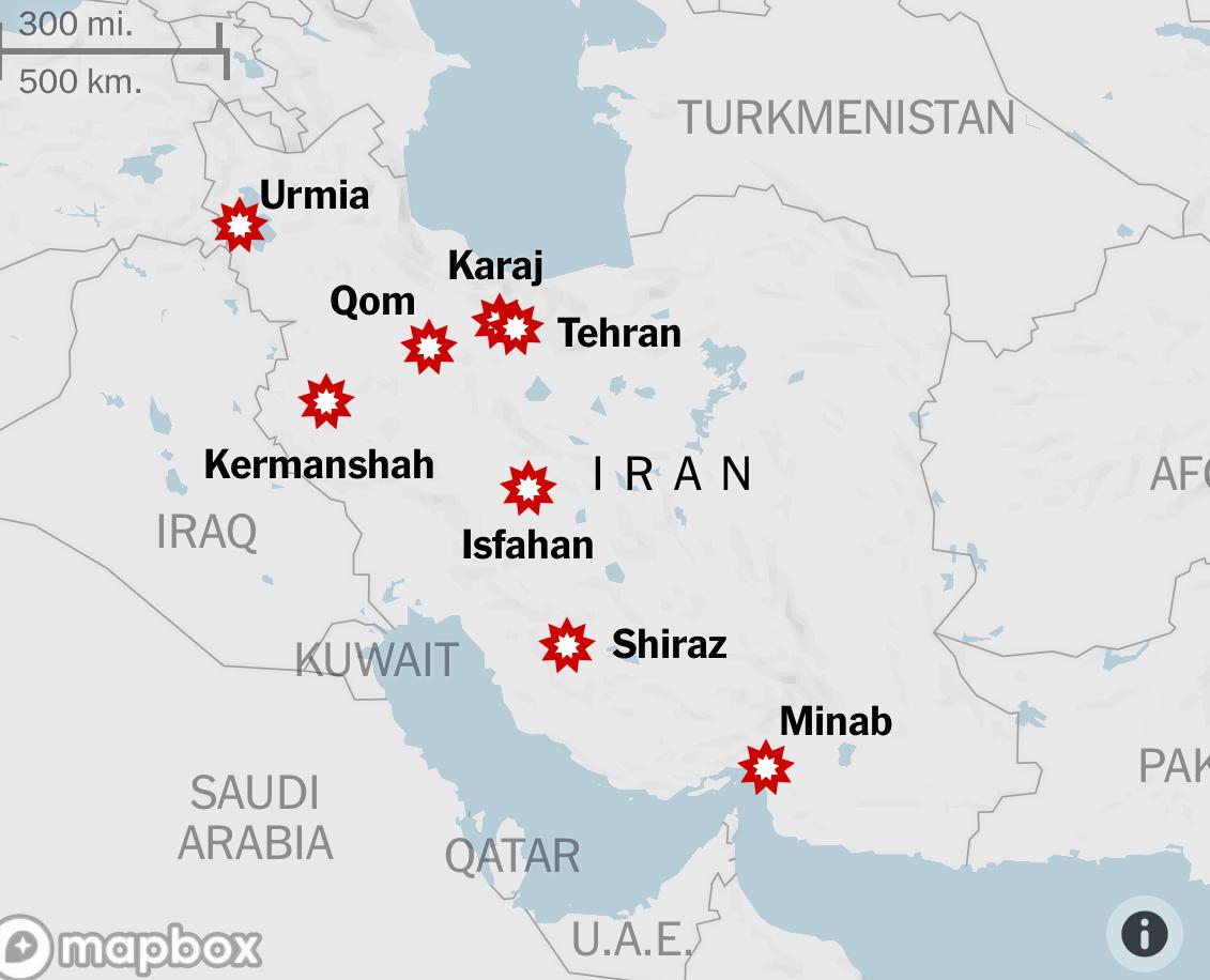 По информации иранского Красного Полумесяца, ударам подверглись 20 из 31 провинции страны. Взрывы зафиксированы в Ширазе, портовом городе Чабахар на юго-востоке и ряде других населённых пунктов. Государственные СМИ Ирана сообщили о десятках погибших в результате удара по женской школе в городе Минаб провинции Хормозган, расположенной у стратегически важного Ормузского пролива, хотя эти данные не получили независимого подтверждения.