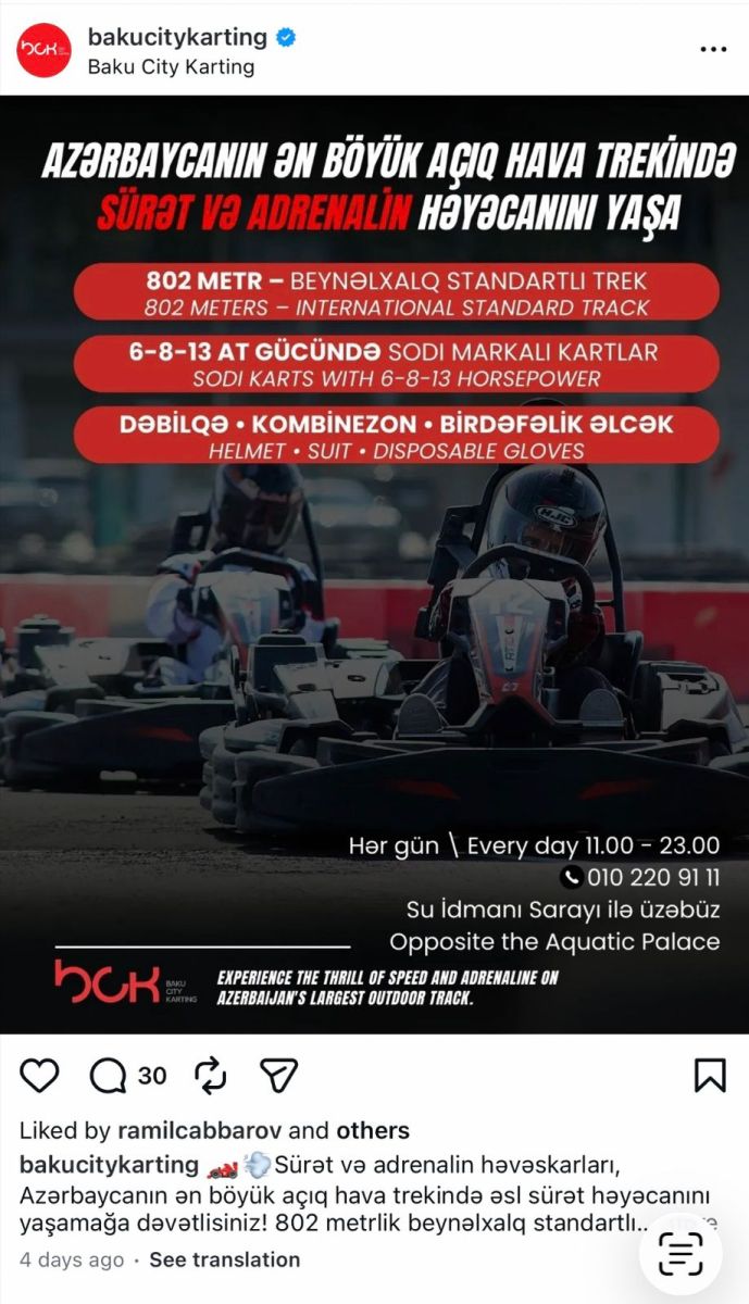 Редакция 1news.az попыталась прояснить ситуацию и в 11:00 по бакинскому времени - как и было указано на официальной странице картинг-центра «Baku City Karting» - мы связались с организацией по контактным номерам.