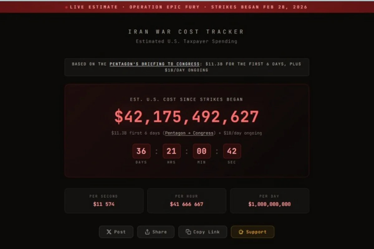 На ресурсе неофициальные данные об американских расходах на проведение военной операции против Исламской Республики обновляются в режиме реального времени. Подсчеты основаны на докладе Пентагона конгрессу, в котором говорилось, что первые шесть дней кампании стоили $11,3 миллиарда, а в дальнейшем расходы составят один миллиард в день.