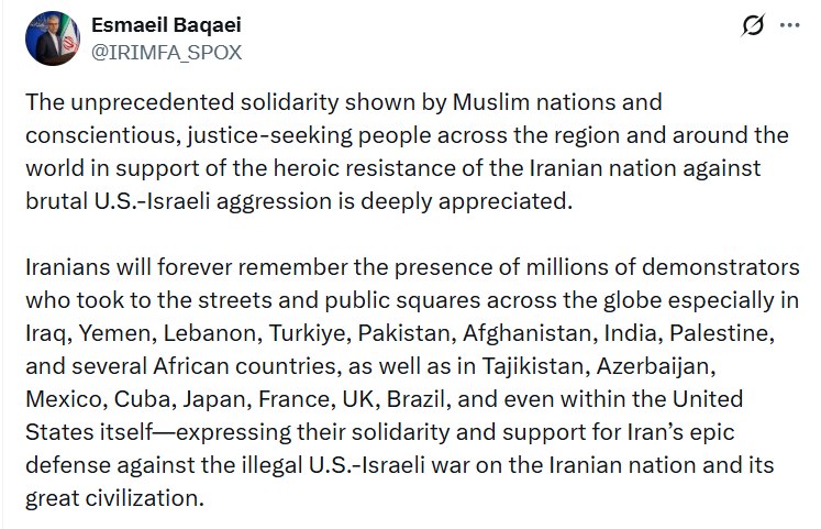 Официальный представитель МИД Ирана Эсмаил Багаи в своём аккаунте в социальной сети X поблагодарил граждан Азербайджана и других стран за проявленную солидарность с иранским народом в период конфликта.